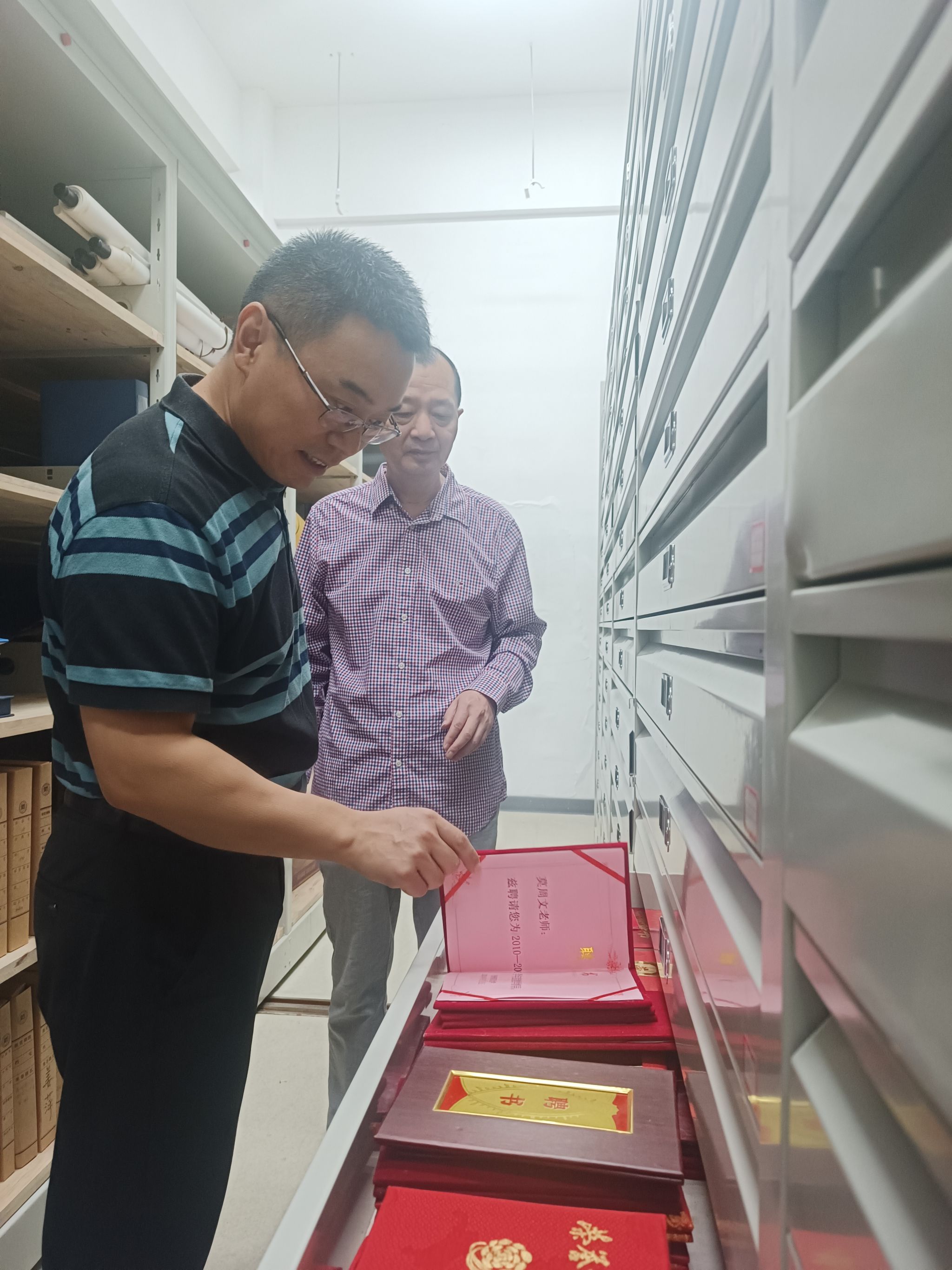 张道伟副校长首先实地察看了档案馆各办公室、库房、校史馆等功能区域。在查阅服务大厅,他与工作人员亲切交流,了解档案查阅流程、师生及校友咨询办理量、线上线下服务衔接等情况,对我馆开展的网络预约查询,快递服务到家等便民举措给予肯定,并叮嘱“要持续优化服务体验,让档案服务更有温度”;在编研室,副校长张道伟充分肯定了编研室工作人员在编撰《年鉴》《贵州师范大学八十年志》《师者》等方面取得的成绩,并鼓励大家在口述校史研究、教师博物馆建设等方面继续努力;在库房,他详细了解档案库房的温湿度控制、消防安全设施配置、档案存储分类及防护措施等情况,认真聆听工作人员对珍贵照片、实物、名师手稿等档案的介绍,对档案馆挖掘特色档案资源、传承校园文化的做法表示认可。